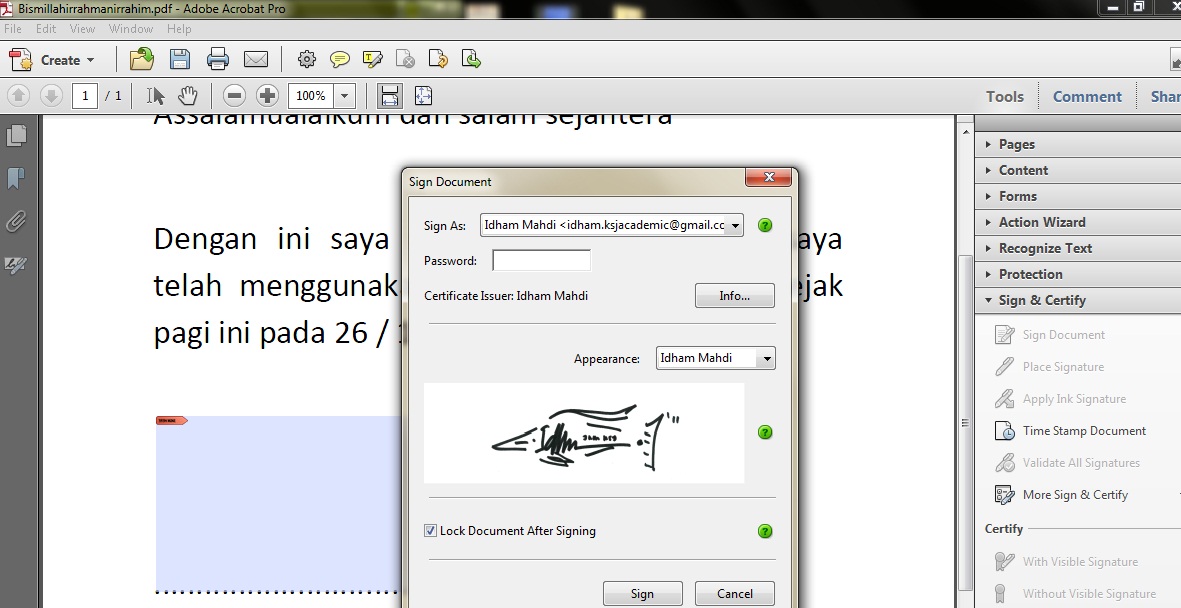 Ah-ha, dah sempurna. Alhamdulillah. Maka siaplah tandatangan digital sata pada dokumen ini. Biasanya surat agreement kerajaan guna fail PDF untuk ditandatangani, dan semestinya, lebih praktikal guna perisian ini.Biasa saya guna microsoft word dan juga gambar tandatangan saya berformat gif... hari ini saya guna software canggih sikit.